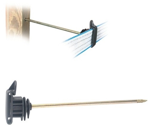 Izolator do taśmy z trzpieniem o długości 20 cm. Trzpień metalowy z wkrętem do drewna, może być również montowany w słupkach betonowych za pomocą kołków rozporowych. Izolator posiada wzmocnione kołnierzyki zapobiegające przebiciom. Ich główna zaleta to możliwość odsunięcia linii ogrodzenia od istniejącego już płotu.