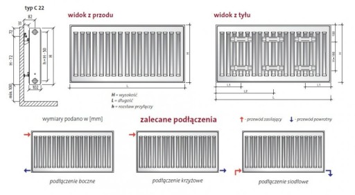Moc grzewczą podajemy przy dwóch najpopularniejszych parametrach grzewczy. Z grzejnika danej wielkości możemy uzyskać różne moce grzewcze w zależności od temperatury wody jaką doprowadzimy do kaloryfera. Kaloryfer typu C22 - posiada 2 płyty grzewczą i 2 radiatory /harmonijki wewnątrz kaloryfera/