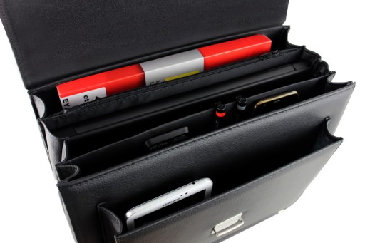 Wewnątrz teczki znajdują się trzy przegrody, kieszeń na zamek, miejsce na długopisy, wizytówki i telefon komórkowy. Wnętrze teczki wyścielone podszewką elastyczną.