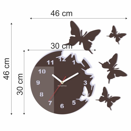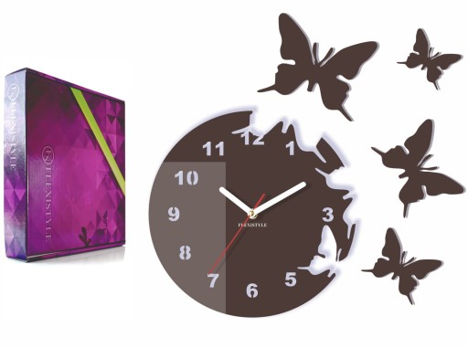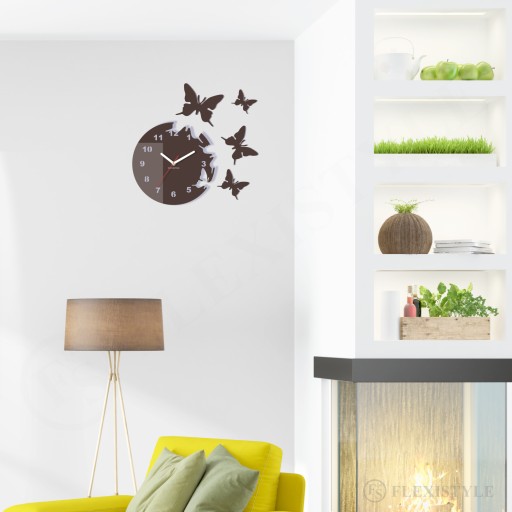 Radosny design zegara w postaci odlatujących motylków. Jeden z bestsellerów firmy FLEXISTYLE. Śliczna ozdoba każdej ściany. Wzór nadaje lekkości wnętrzu. Dla osób z fantazją.