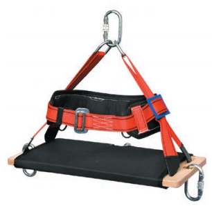 Ławka do prac na wysokości, wyposażona w pas bezpieczeństwa i siedzisko z wykładziną termoizolacyjną.