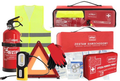 Polskie i Europejskie kraje wymagają posiadania gaśnicy, trójkąta i kamizelki w samochodzie, dodatkowo wymaga aby w potrzebie udzielić pierwszej pomocy poszkodowanym czyli mieć również apteczkę pierwszej pomocy. Zestaw ten jest tak dopracowany aby sprostać tym wymaganiom. Dodatkiem jest wysokiej jakości latarka warsztatowa z wbudowanym magnesem i kilkoma rodzajami sygnalizacji, w tym SOS. Całość jest ładnie zapakowana w wodoodporny, zamykany na suwak pokrowiec który w bagażniku mocowany jest na rzepy które znajdują się na spodzie pokrowca. Wszystkie oferowane w nim produkty są nowe z gwarancją.