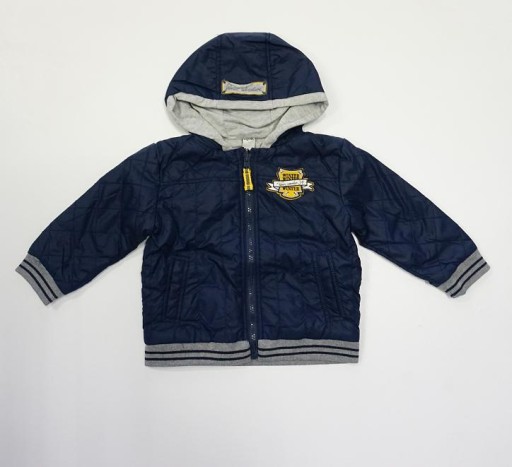 Kurtka z kapturem w kolorze granatowym, zapinana na zamek, z przodu dwie kieszonki, rękawy i dół wykończone ściągaczem, w środku bawełniana podszewka.