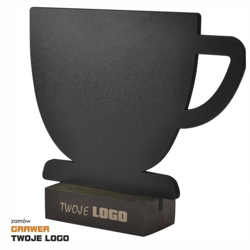 Tabliczka kredowa stojąca w kształcie KUBKA na drewnianej, lakierowanej podstawie. Można po niej pisać kredą lub markerem kredowym. Doskonała by na niej prezentować informacje dotyczące aktualnej oferty, ceny czy promocji. Dzięki oryginalności formy jest ozdobą każdego wnętrza. Doskonała do restauracji, kawiarni, pubu, baru czy hotelu. Zwraca uwagę klientów, a dzięki niewielkim rozmiarom można ją ustawić na stoliku, ladzie, barze, półce czy parapecie.