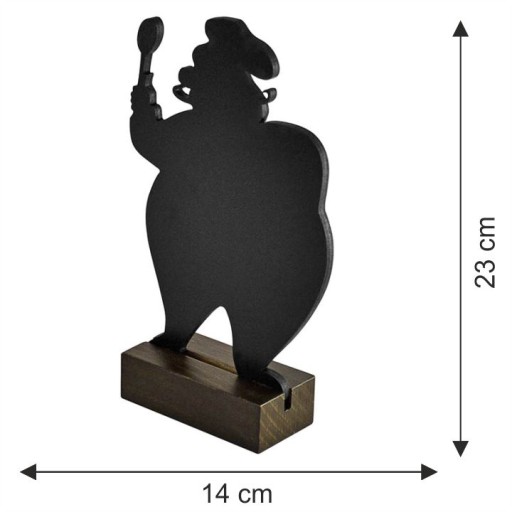Tabliczka kredowa stojąca w kształcie KUCHARZA na drewnianej, lakierowanej podstawie. Można po niej pisać kredą lub markerem kredowym. Doskonała by na niej prezentować informacje dotyczące aktualnej oferty, ceny czy promocji. Dzięki oryginalności formy jest ozdobą każdego wnętrza. Doskonała do restauracji, kawiarni, pubu, baru czy hotelu. Zwraca uwagę klientów, a dzięki niewielkim rozmiarom można ją ustawić na stoliku, ladzie, barze, półce czy parapecie.