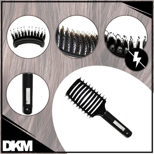 - Średniej twardości (lekko zaokrąglona na końcach) szczecina – jest wyjątkowo łagodna i bezpieczna dla włosów oraz skóry głowy