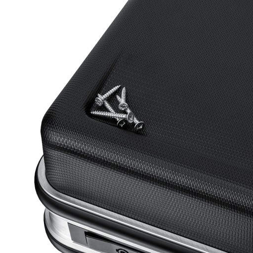 - Dno walizki o wysokości 50 mm, które można mocować za pomocą przycisku, możliwość dalszego podziału za pomocą przekładek, panel pokrywy z 12 dużymi kieszeniami na narzędzia i jedną płaską komorą