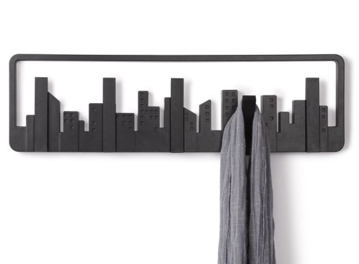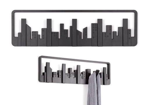 Wieszak na ubrania Skyline, to niebanalna ozdoba w sypialni i korytarzu. 5 wieszaków na ubrania. Pozostałe elementy tworzą panoramę miasta z wieżowcami, zamknięte ramką. Kiedy na wieszakach nic nie wisi, wieszak może służyć jako dekoracja ścienna, która przyciąga uwagę. Spodoba się miłośnikom designu i sztuki nowoczesnej.