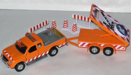 Auto model metalowy pick-up MITSUBISHI z otwieranymi drzwiami i napędem Pull Back i z przyczepką pomoc drogowa z tablicą ze świecącą pulsacyjnie w kolorze pomarańczowym strzałką i znakiem "nakaz jazdy z lewej strony znaku". Tablicę można unosić i opuszczać.