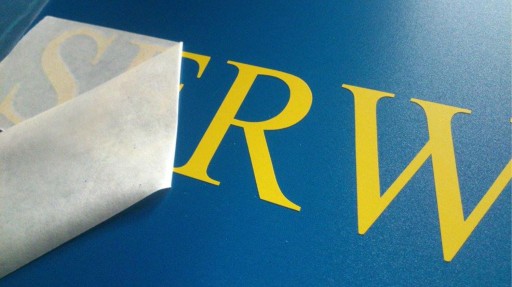 Naklejki litery i cyfry wycięte z samoprzylepnej folii odpornej na warunki atmosferyczne.