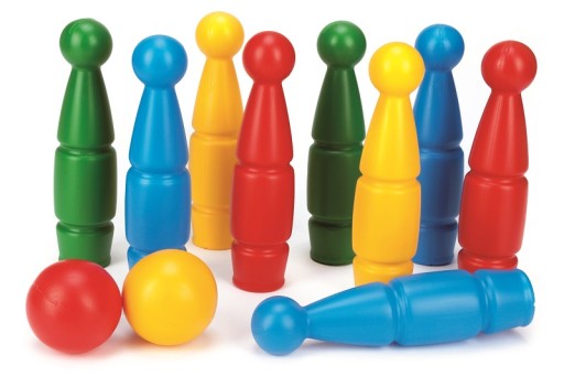 W skład zestawu wchodzi 9 kolorowych kręgli oraz dwie kule.