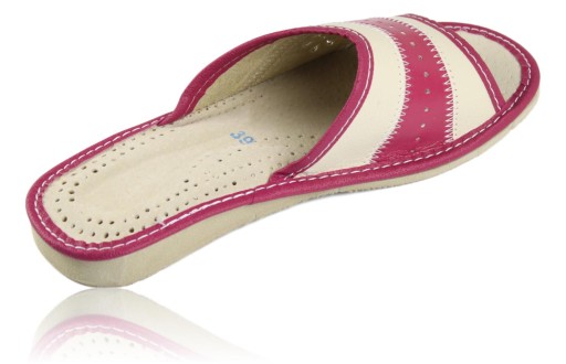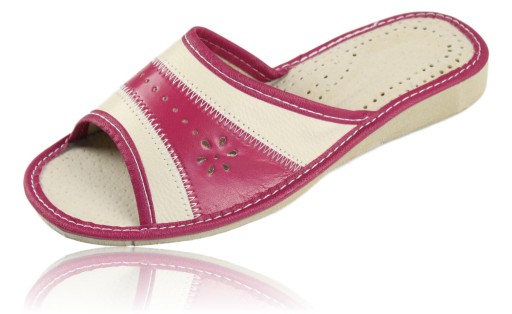 Kolorowe kapcie z tłoczonym wzorem na cholewce, wykonane ze skóry syntetycznej.