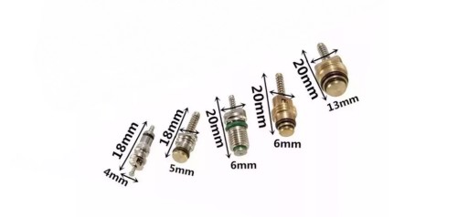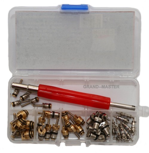 W skład zestawu wchodzi klucz do wykręcania / wkręcania zaworków oraz 6 różnych typów zaworków. Zawory serwisowe znajdują zastosowanie w klimatyzacji samochodowej.