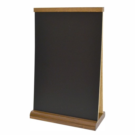 Duża (rozmiar A4) stożkowa tabliczka kredowa na drewnianej, lakierowanej podstawce w kolorze brązowym. Można po niej pisać kredą lub markerem kredowym. Przeznaczona do prezentacji informacji dotyczących aktualnej oferty, ceny czy promocji. Doskonała do restauracji, kawiarni, pubu, baru czy hotelu. Zwraca uwagę klientów. Można ją ustawić na stoliku, ladzie, barze, półce czy parapecie. W schowku pomiędzy dwiema tabliczkami można dodatkowo umieścić ulotki, wizytówki czy serwetki.