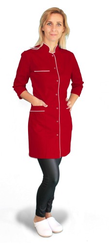 Rękaw ma długość ¾, natomiast cały fartuch sięga do połowy uda.