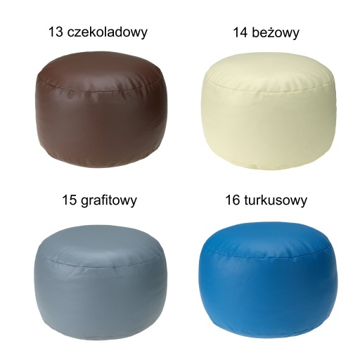 Przedmiotem aukcji jest okrągła pufa roller, w 20 wersjach kolorystycznych do wyboru. Wymiary pufy to 40cm średnicy i 25cm wysokości. Wersję kolorystyczną można wybrać dowolnie przy zakupie, wybierając wersje kolorystyczne z wzornika lub palety barw znajdującej się na aukcji. Instrukcję dot. dobierania kolorów opisujemy w tekście poniżej. Pufa jest meblem bezszkieletowym, dlatego jej wymiary mogą się zmieniać w zależności od wagi osoby użytkującej, ułożenia pufy lub doboru wypełnienia. Pufa jest standardowo wypełniona mieszanką sprężystych materiałów do produkcji mebli, które zapewniają trwałość i komfort użytkowania. Roller został wykonany z ekoskóry dollaro, która posiada atest PZH.