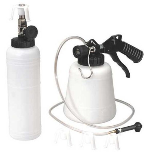 Zestaw pozwala na pracę jednoosobowe wykonanie napełnienia oraz odpowietrzenia układu hamulcowego przy pomocy ciśnienia 6-8 Bar (90-120 PSI) z instalacji pneumatycznej (kompresora).