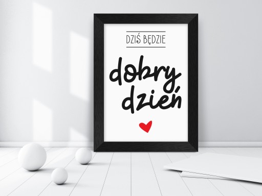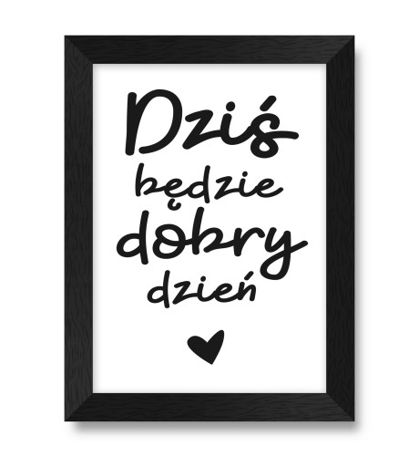 Oferowany na aukcji jest obrazek w drewnopodobnej ramce ze stylowym napisem "Dziś będzie dobry dzień" wybieranym spośród 9 wzorów (lista dostępnych kompozycji znajduje się w dalszym opisie aukcji). Rozmiar zewnętrzny ramki wynosi 15 cm x 20 cm, rozmiar obrazu (wnętrze ramki) to 13 cm x 18 cm. Wzór obrazka wydrukowany został w technice cyfrowej na delikatnym, kredowo-matowym papierze o gramaturze 350 g. Przód obrazka chroniony jest przeźroczystą pleksi.