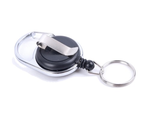 RETRAKTOR - zwijana smycz / linka nylonowa, w formie breloka z mini karabińczykiem, metalowym kółkiem sprężynowym i metalowym, obrotowym uchem/klipsem.