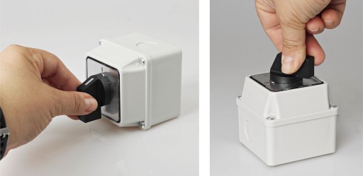 Łączniki krzywkowe w obudowie umożliwiają sterowanie przepływem prądu w kilku obwodach.