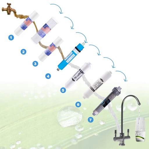 Woda przepływająca przez system poddana jest 7 stopniowej filtracji na którą składają się: