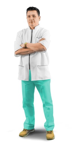 Rękawy fartucha dosięgają do łokci, natomiast całość sięga poniżej linii bioder.