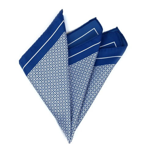 Biało-niebieska poszetka w drobny wzór geometryczny. Wykończona imitacją ręcznego rolowania. Bardzo elegancki i ponadczasowy wzór.