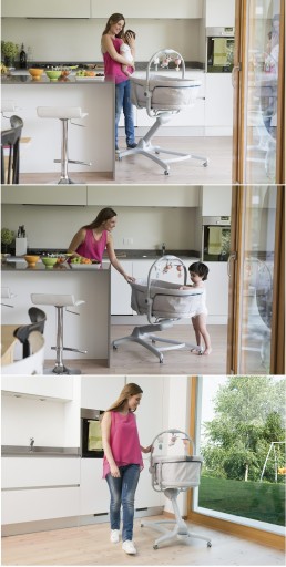 Radość wspólnych posiłków już od najwcześniejszych lat! Przechyl go do pozycji siedzącej, zapnij dziecku pasy, i przysuń do stołu. Dzięki regulacji wysokości idealnie dopasuje się do każdego stołu.