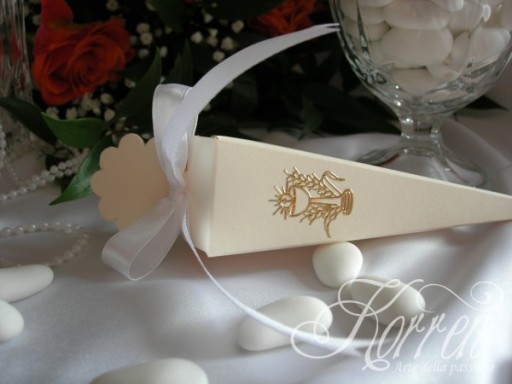 Eleganckie pudełeczko rożek z hostią wykonane z wysokiej jakości papieru, w środku 5 szt lukrowanych słodkości w sakiewce tiulowej wszystko ozdobione perfekcyjnie zawiązaną kokardką oraz dołączony bilecik z nadrukiem, wierszyk, imiona i data.
