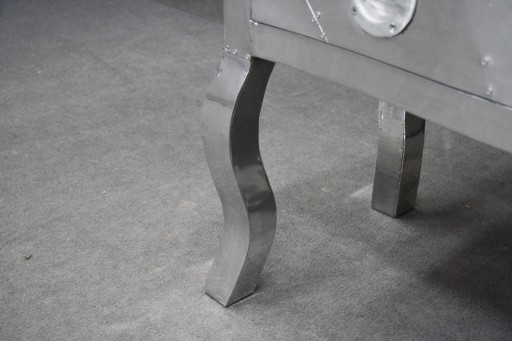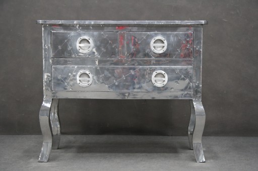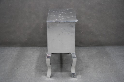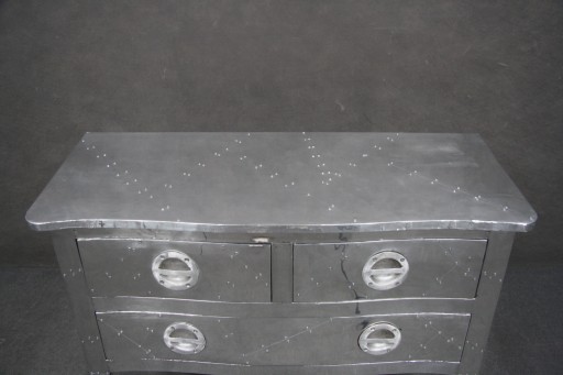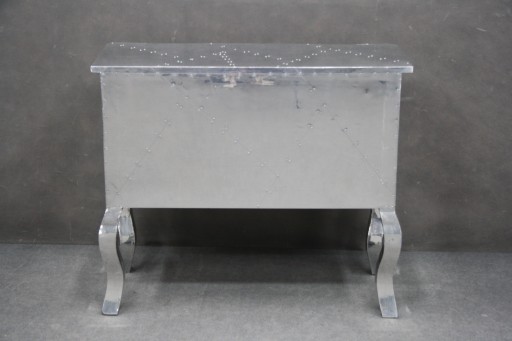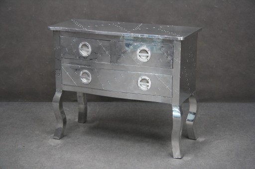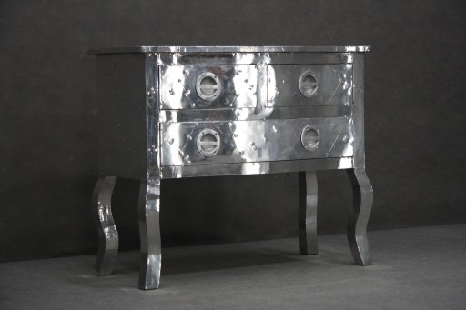 Konsola jest nowa. Wykonana z płyty MDF pokrytej polerowanym aluminium. Specyficzne połączenie elementów metalowych przymocowanych wkrętami oraz nietypowe uchwyty, podkreślają indywidualny i niepowtarzalny styl. Każdy mebel jest unikalny, ze względu na ręczną produkcję (małe rysy, delikatne obicia, otarcia i różnego rodzaju nierówności są wykonywane celowo i są naturalne dla tej serii). Nietypowe połączenie metalu oraz kształty zwrócą uwagę i rozjaśnią pomieszczenie w którym się znajdą. Unikalna konstrukcja zapewnia stylowy wygląd i może być łączona z innymi meblami jako pojedynczy element dekoracji lub jako cała seria, która jest dostępna na pozostałych aukcjach.