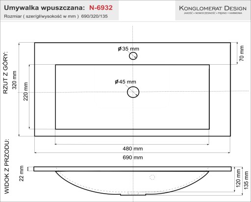 Umywalka konglomeratowa NEW LINE 69 prostokątna z powłoką NanoShine wąska N-6932 apm Produkt wpuszczana w blat meblowa 69x32 cm