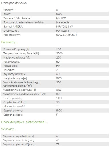 - zastosowanie markowych diod EDISON zapewnia wysoką jakość uzyskanego światła i długoletnią pracę kinkietu