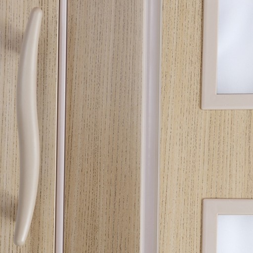 Zastosowane przeszklone, komorowe panele drzwiowe posiadają matową strukturę drewna, połączone za pomocą elastycznych (gumowych) zawiasów.