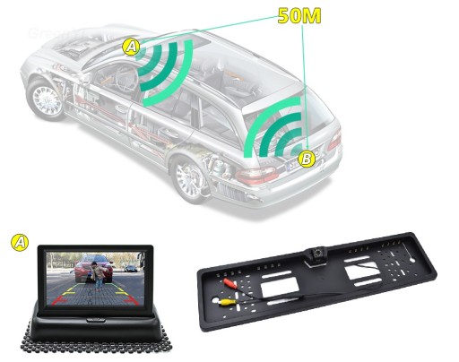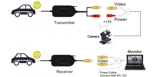 Bezprzewodowy ZESTAW umożliwia bezprzewodową transmisję sygnału VIDEO. Współpracuje z samochodową kamerą cofania a monitorem lub innym sprzętem video wyposażonym w dodatkowe wejście sygnału video (RCA)