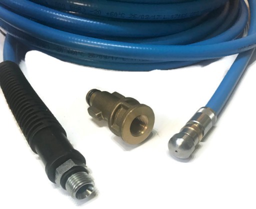 Wąż ten ma zmniejszoną średnicę zewnętrzną oraz skróconą tulejką zaciskową od strony dyszy, dzięki czemu idealnie nadaję się do czyszczenia kolanek rur o małych średnicach.