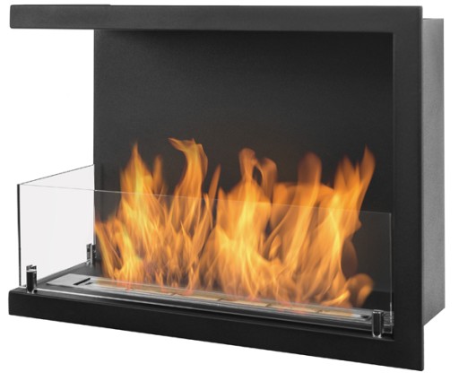 Biokominek narożny, z otwartym bokiem do montażu w zabudowie (także z płyt G-K) lub w istniejącym otworze ściany. Na odwrocie biokominka umieszczono uchwyty ułatwiające montaż.