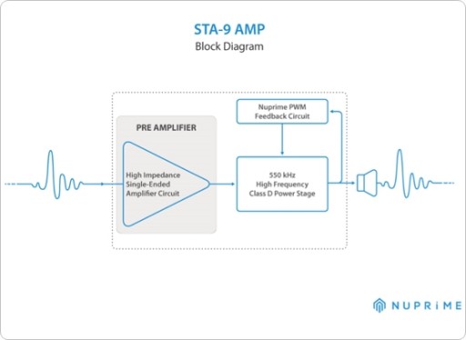 Hybrydowa konstrukcja wzmacniacza NuPrime STA-9 łączy ze sobą wysoką wydajność prądową oraz ciepłą barwę dźwięku zbliżoną do wzmacniaczy pracujących w klasie A. Wykorzystany obwód samooscylujący z konstrukcji klasy D do generowania modulacji analogowej, umożliwia przełączanie się wzmacniacza na częstotliwości 550 kHz.