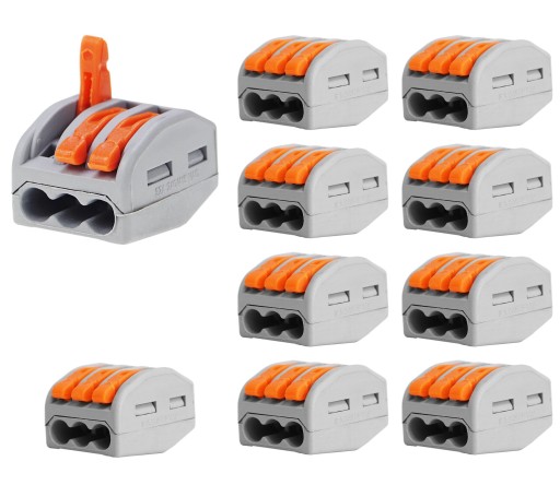 Szybkozłączka do łączenia przewodów linkowych, 3 zaciski - dźwignie, kolor szary.