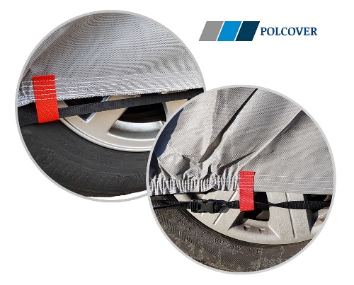 Pokrowiec wyposażony został w gumy ściągające zachodzące pod zderzaki auta, które zapewniają natychmiastowe umiejscowienie pokrowca na pojeździe. Dodatkowo po obwodzie pokrowca przebiega gruby pas mocujący przewlekany przez oczka, który zapewnia niezawodne zabezpieczenie przed silnym wiatrem.