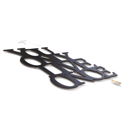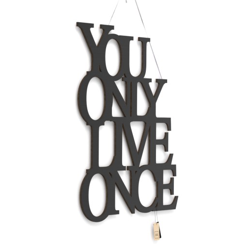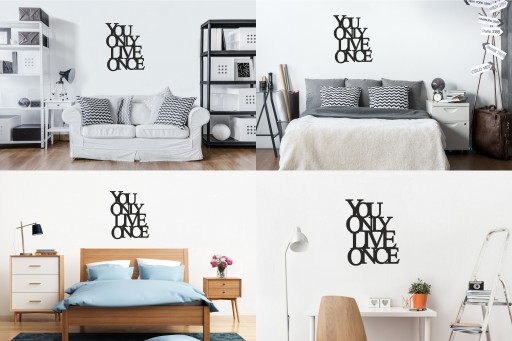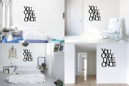 Do zamówienia (przy wyborze płyty hdf) dołączamy dwustronnie samoprzylepną taśmę piankową. Taśma nadaje się do użycia na gładką i czystą powierzchnię (większość ścian). Taśmę należy samodzielnie zamocować z tyłu napisów. Do trudniejszych powierzchni takich jak tynk strukturalny lub płytki - wycięte z płyty hdf napisy można mocować również w inny sposób - we własnym zakresie (np. na klej). Przy wyborze surowego drewna (sklejki) - taśma nie jest dołączana (mocowanie we własnym zakresie, np. na klej). Projekt jest jednoelementowy (wszystkie litery tworzą jedną całość) - można go zatem również powiesić np. na haczykach, gwoździku, sznurku itp.