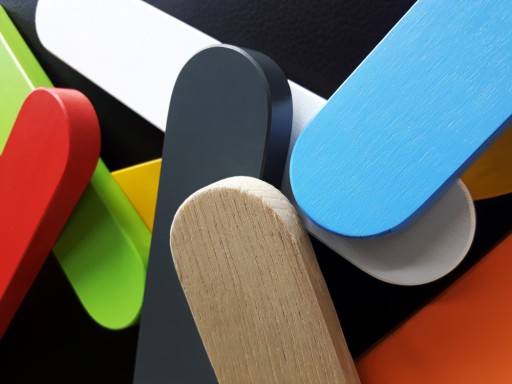 W zestawie znajdują się drewniane uchwyty w wielu kolorach do wyboru: