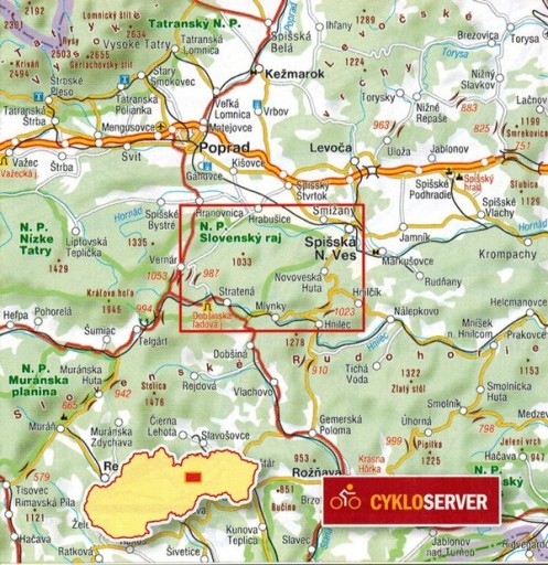 Składana, jednostronna mapa turystyczna Słowackiego Raju w skali 1:25 000, czeskiego wydawnictwa Shocart. Zasięg mapy to: Hranovnica, Hrabusice i Smizany na północy, Spisska Nova Ves i Hnilcik na wschodzie, Hnilec, Mlynky i Dedinky na południu oraz Dobsinska Ladova Jaskyna i Vernar na zachodzie.