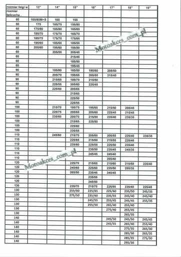Jeżeli posiadasz inny rozmiar opony , poniższa tabela pomoże określić jaki rozmiar łańcucha powinien być zastosowany