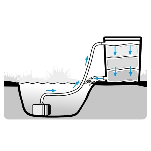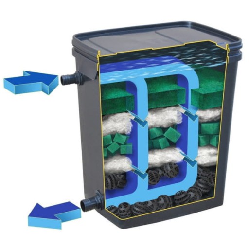 Wyposażony jest we wkłady filtracyjne, a odpowiedni dobór i rozmieszczenie materiałów filtracyjnych zapewnia prawidłową filtrację oczka wodnego.