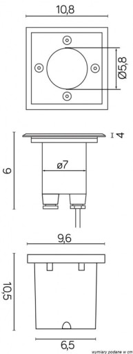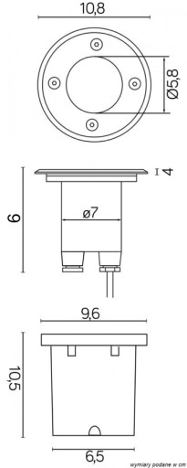 Oprawa składa się z dwóch elementów - oprawy ze źródłem światła led o wymiarach; wys. 9 cm x średnicy fi 10,8 oraz puszki montażowej o wymiarach wys. 10,5 cm x średnica górna fi 9,6 x średnica dolna puszki fi 6,5 cm.