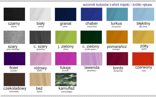 Kolory: Biały, Czarny, Czerwony, Granatowy, Pomarańczowy, C. Zielony, Żółty, Szary, Chabrowy, Błękitny, Turkus, C. Szary, J. Zielony, Fiolet, Róż, Fuksja, Lawenda, Bordo, Czekoladowy, Beż, Moro-Kamuflaż,