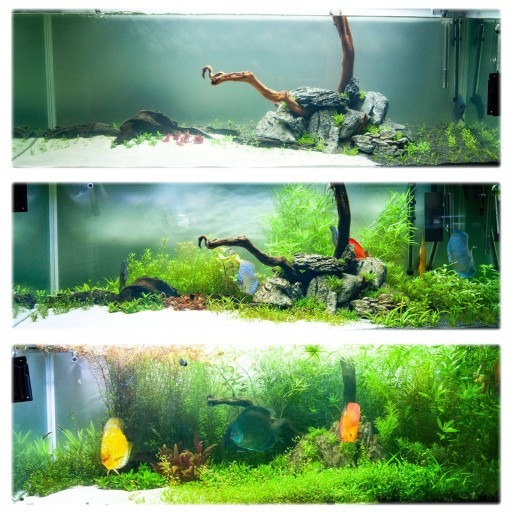 Poniżej przedstawiamy kilka zdjęć jednego z naszych firmowych akwariów. Prezentowany zbiornik w całości obsadzono roślinami in vitro, które można kupić w naszym sklepie. Posadzono w nim również większość gatunków składających się na niniejszy zestaw. Na fotografiach widać jak łatwo przyjęły się roślinki oraz jak szybko i bujnie porosły cały zbiornik. Fotografie wykonano w 1, 14 i 70 dniu życia akwarium