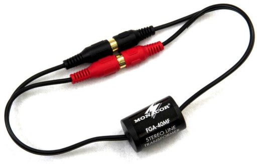 Izolator masy, niewielki rozmiar, do eliminacji zakłóceń i przydźwięków związanych z pętlą masy, powstającą np. przy podłączaniu karty dźwiękowej komputerów PC lub laptopów do wzmacniacza.