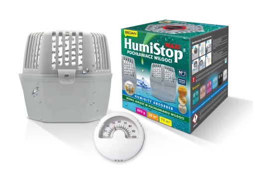 Najwyższej jakości pochłaniacz wilgoci "HUMISTOP MAXI" kontroluje i samodzielnie reguluje nadmiar wilgoci w pomieszczeniach.