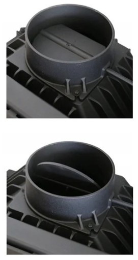 Dolot zimnego powietrza fi 100 do wkładów żeliwnych, który ma na celu doprowadzenie świeżego powietrza do paleniska z zewnątrz budynku. Nie wymaga montażu dodatkowego elementu: przejście dolot - rura. Montuje się go na dole z tyłu wkładu.